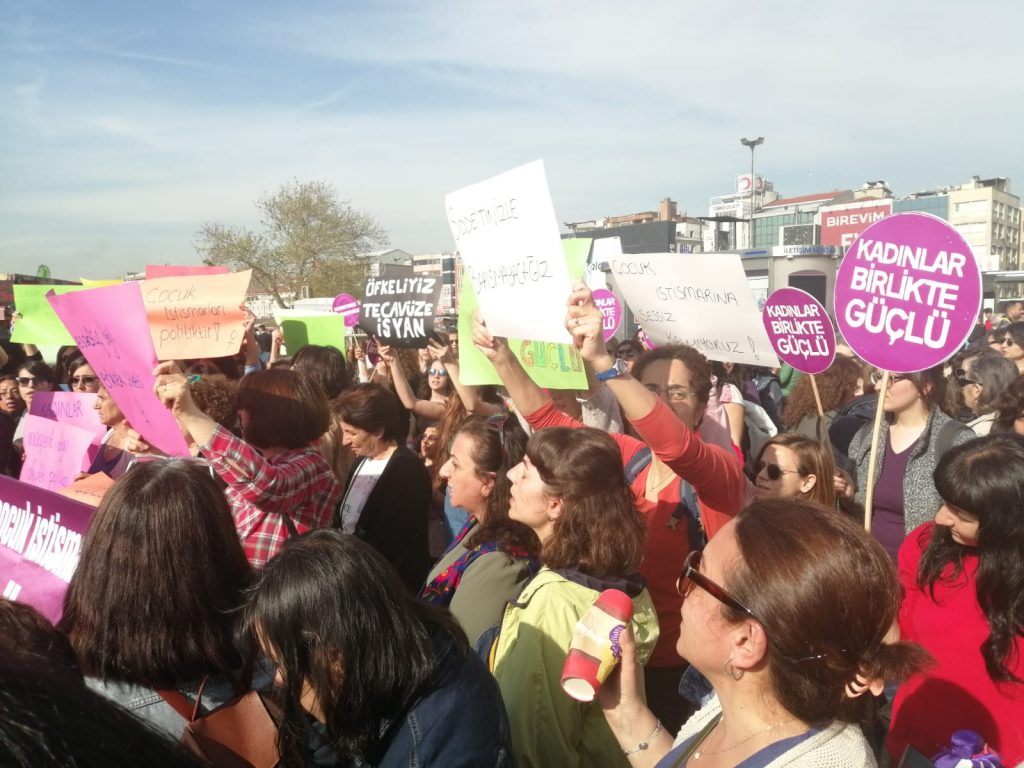 “Münferit değil erkek şiddeti”, “yaşasın kadın dayanışması”, “çocuk istismarı son bulsun”, “kadınları değil istismarı engelle” sloganlarının sık sık atıldığı eyleme çevredeki insanlar da alkışlarıyla destek oldular.