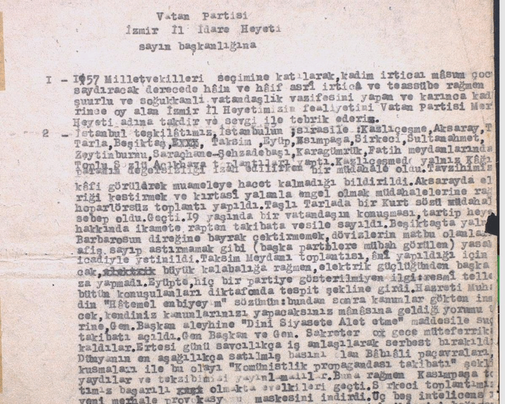 1 1957 Seçimlerinde Vatan Partisi’nin miting yaptığı bölgeler: Kazlıçeşme, Aksaray, Taşlı Tarla, Beşiktaş, Taksim, Eyüp, Kasımpaşa, Sirkeci, Sultanahmet, Zeytinburnu, Saraçhane-Şehzadebaşı, Karagümrük, Fatih.