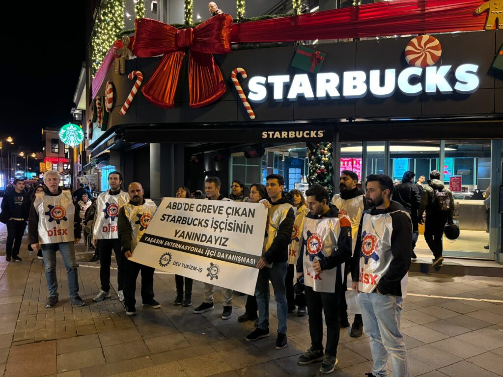 DİSK/Devrimci Turizm İşçileri Sendikası (Dev Turizm-İş), ABD’dedeki Starbucks işçilerinin grevine destek amacıyla İstanbul Kadıköy’deki Starbucks mağazası önünde basın açıklaması düzenledi. Sendika, ABD’li işçilerin düzensiz çalışma saatlerine, düşük ücretlere ve kronik personel yetersizliğine karşı sürdürdüğü mücadelenin önemine dikkat çekerek “Starbucks işçilerinin örgütlenme ve mücadele kararlılığı hepimize örnek oluyor” mesajını verdi.